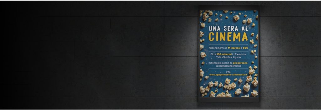 Una sera al cinema è l’abbonamento di AGIS Piemonte e Valle d’Aosta che comprende 11 ingressi a prezzo scontato, utilizzabili anche da più persone contemporaneamente, in oltre 100 sale cinematografiche diffuse su tutto il territorio.